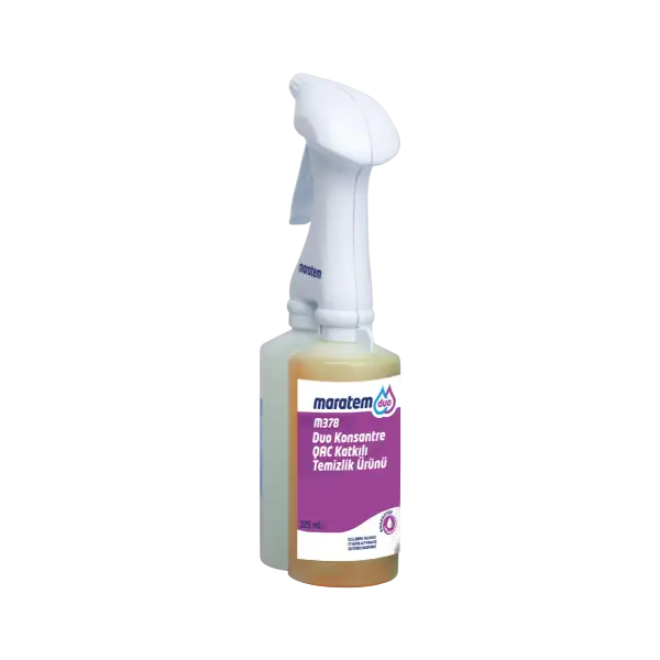 Maratem M378 Duo’nun formülü, protein, yağ ve diğer organik kirleri hızlıca çözerek yüzeylerin daha hijyenik ve temiz olmasını sağlar. QAC katkısı, aynı zamanda mikroorganizmalar üzerinde de temizlik ve hijyen etkisini artırır.